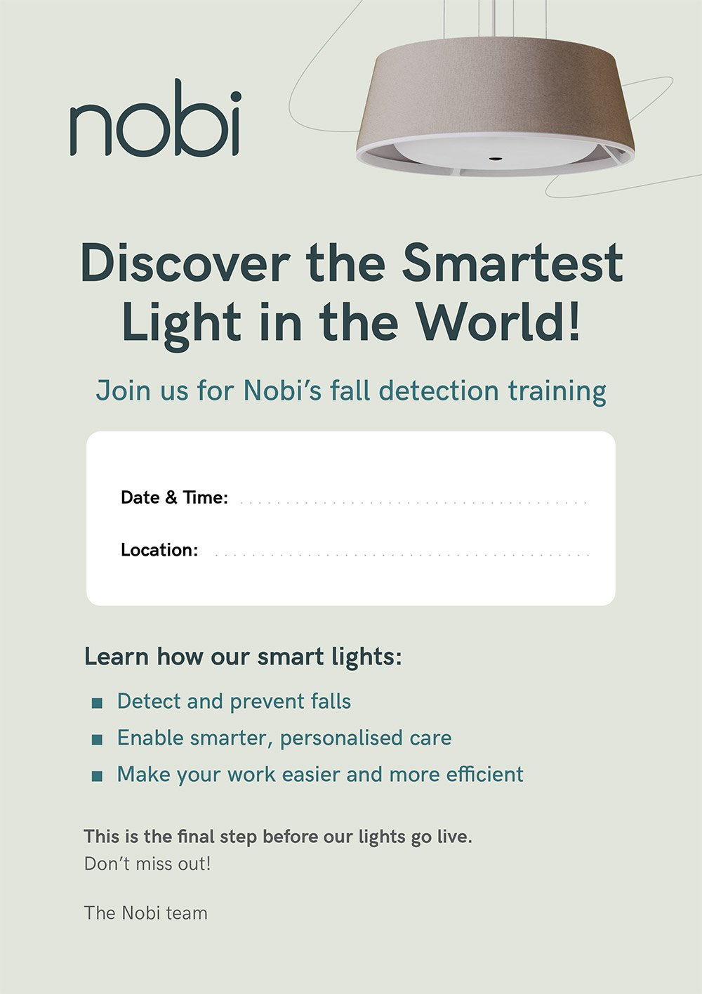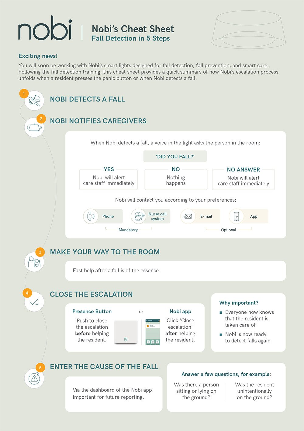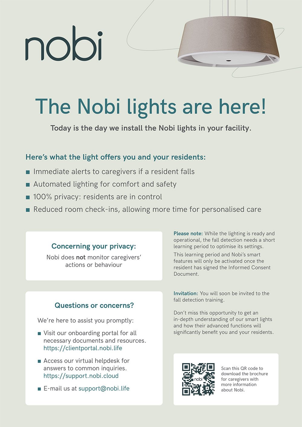 These materials keep care staff up to date with the Nobi lights installation and onboarding process at all times. Also take a look at the Nobi Cheat Sheet, which conveniently summarises the escalation process.