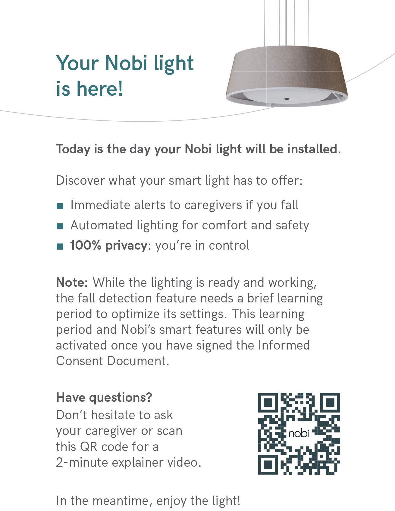 These information cards allow care staff to keep their residents informed about the installation and onboarding process of the Nobi lamps in their housing unit.